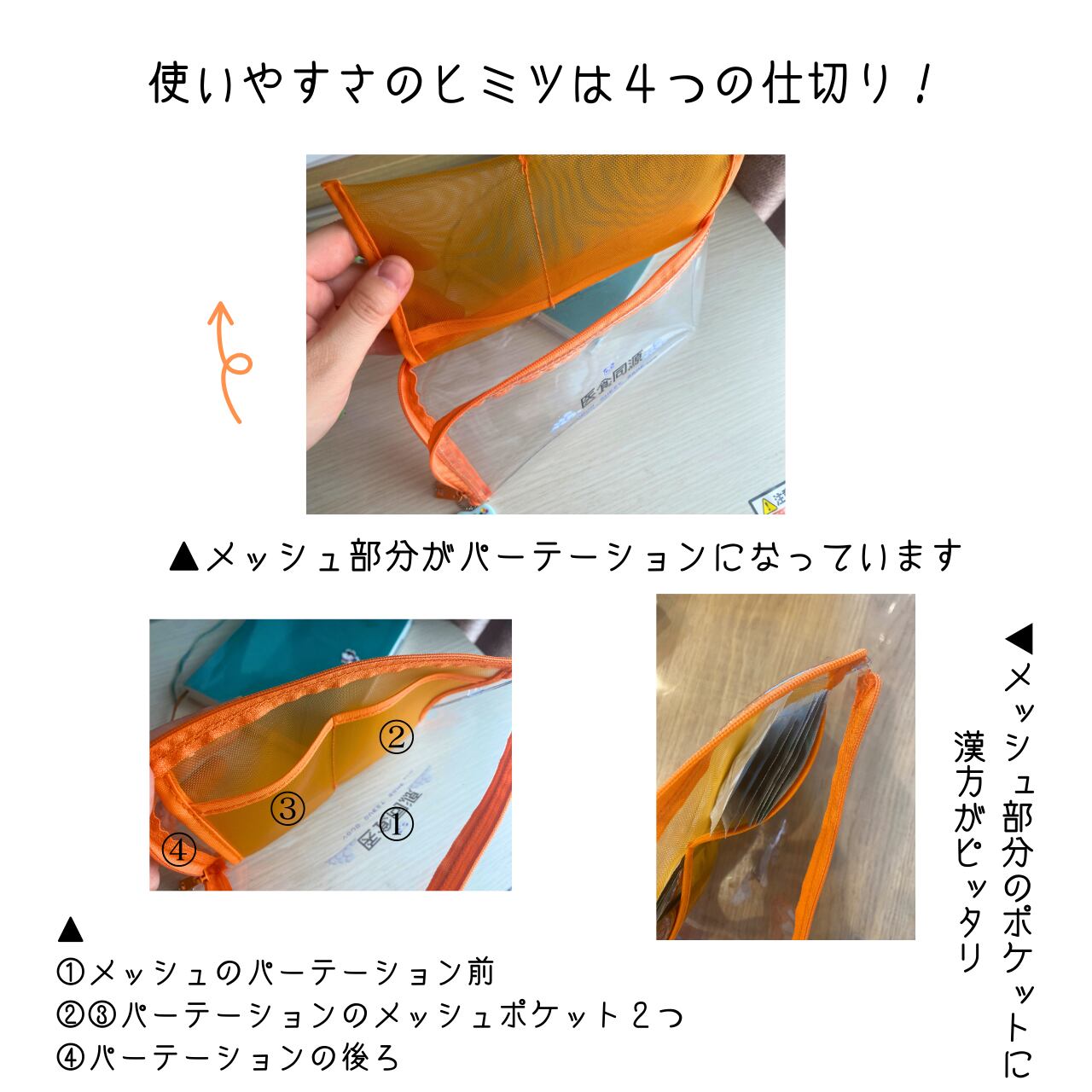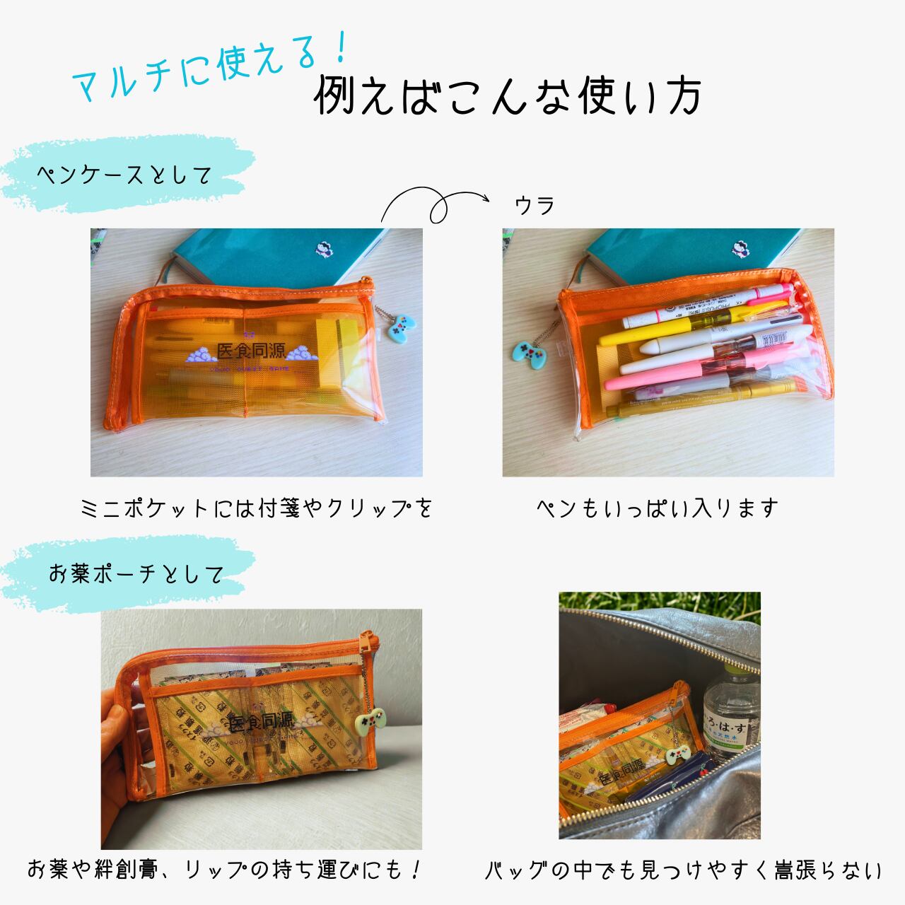 透明感のあるスケルトン素材だから中身がひと目で分かり、