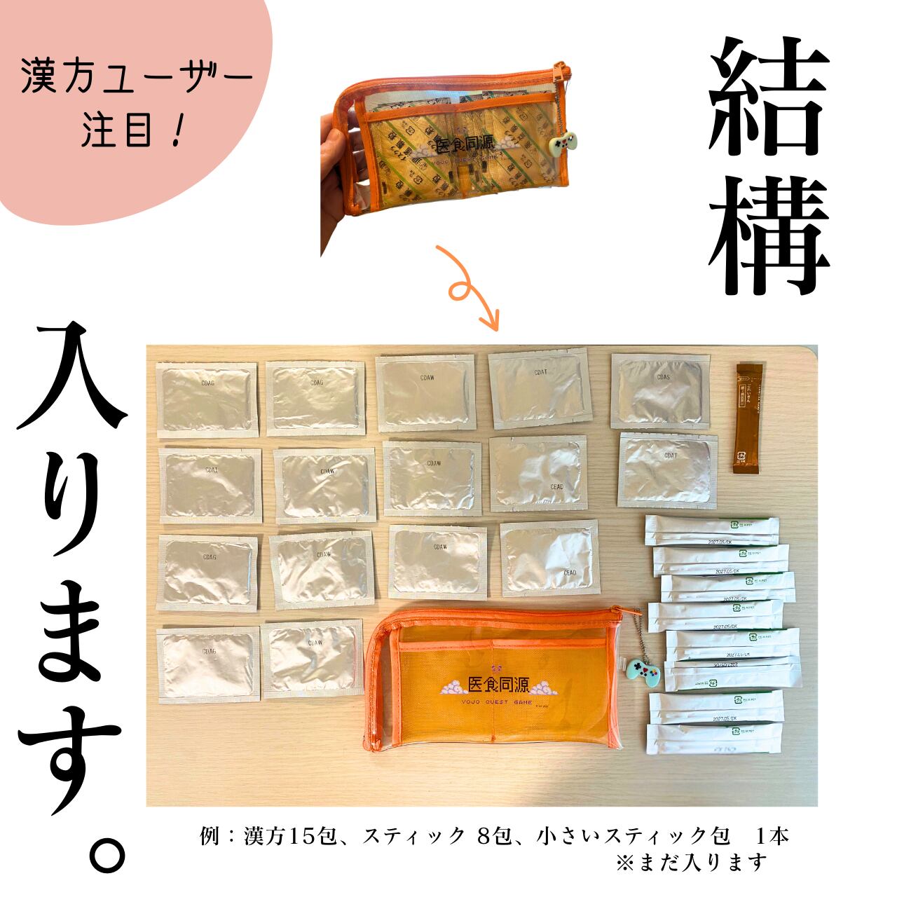 ポケットがたくさんあるから、スティック包装や粉薬、円皮鍼や絆創膏、